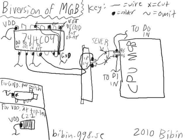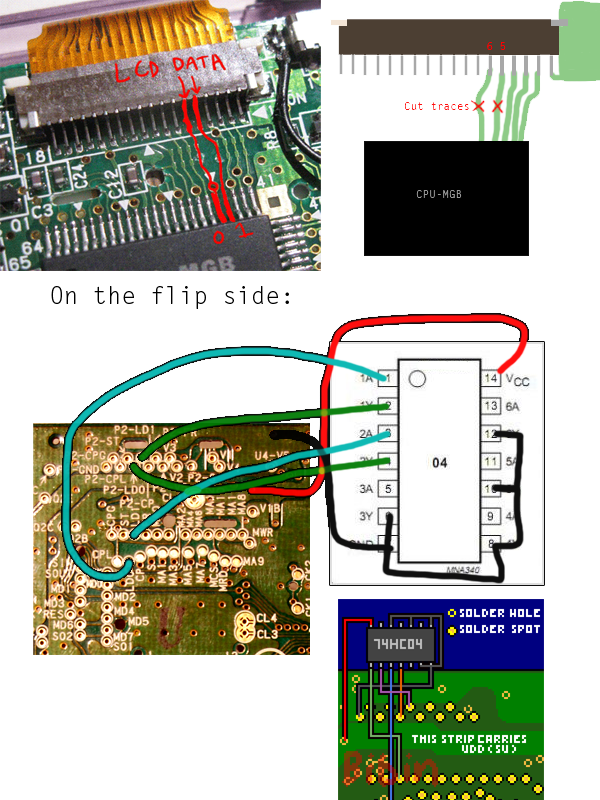 On the DMG (Original Game Boy) this is easy – the LCD data signal lines have contact points, and are easy to find and wire to. But nobody has documented this for the MGB (Game Boy Pocket)! I had to do some probing and cutting, but I found it, and confirmed the data signal is identical to that of the DMG, and a video-out or in port to either model is possible (You can use a GB Pocket LCD on a DMG even!). CPU pins 45 and 46 go to pins 13 and 14 on the LCD connector, respectively. What we’ll be doing is cutting that line, and taking the data from Pin 45 on the CPU, putting it into the 74hc04’s input, and taking the output, and connecting that to the pin 13, and the same for the next pin. Here’s a wiring diagram: