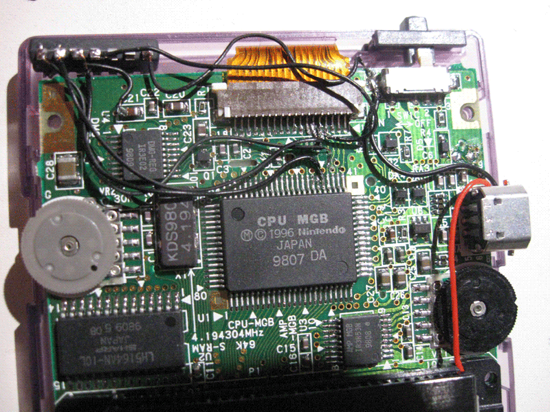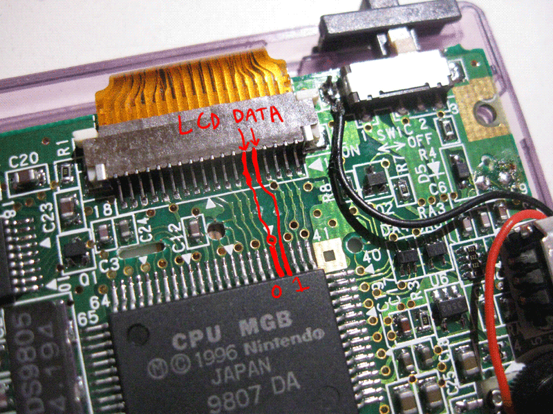 On the DMG (Original Game Boy) this is easy – the LCD data signal lines have contact points, and are easy to find and wire to. But nobody has documented this for the MGB (Game Boy Pocket)! I had to do some probing and cutting, but I found it, and confirmed the data signal is identical to that of the DMG, and a video-out or in port to either model is possible (You can use a GB Pocket LCD on a DMG even!). CPU pins 45 and 46 go to pins 13 and 14 on the LCD connector, respectively. What we’ll be doing is cutting that line, and taking the data from Pin 45 on the CPU, putting it into the 74hc04’s input, and taking the output, and connecting that to the pin 13, and the same for the next pin. Here’s a wiring diagram: