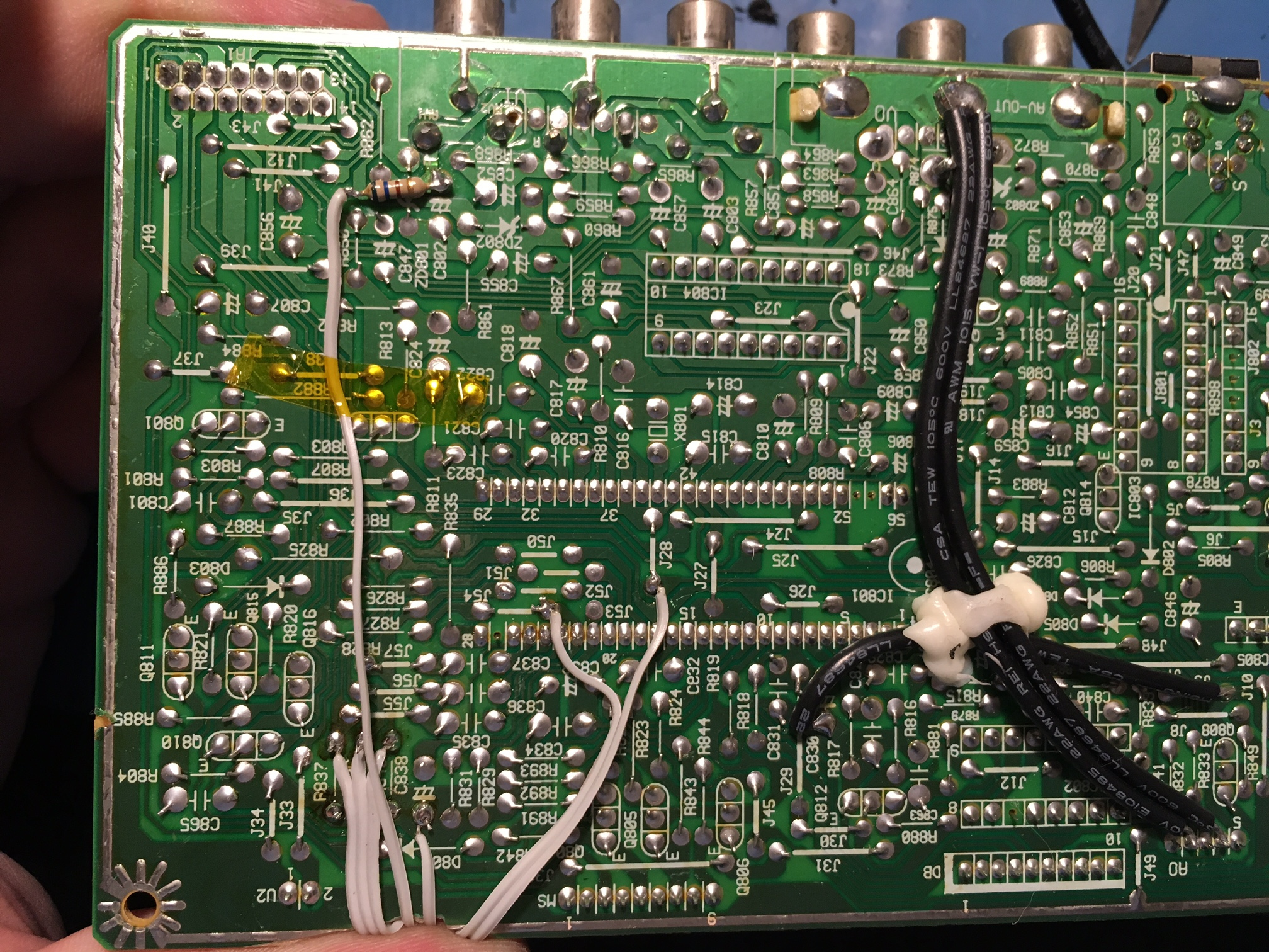 The board terminates the RGB inputs with 680 ohm resistors. I replaced these with 75 ohm resistors. I also tied YS2 high through a low-value resistor (75 ohms was fine) and attached this to a switch to let me use the composite inputs if I need them. I wired a port, bringing RGB to the resistors I had added for termination. I ran sync to the Composite 1 input through a 680 ohm resistor, as it is 75-ohm terminated and I wanted to reduce the current sunk from a TTL sync source.