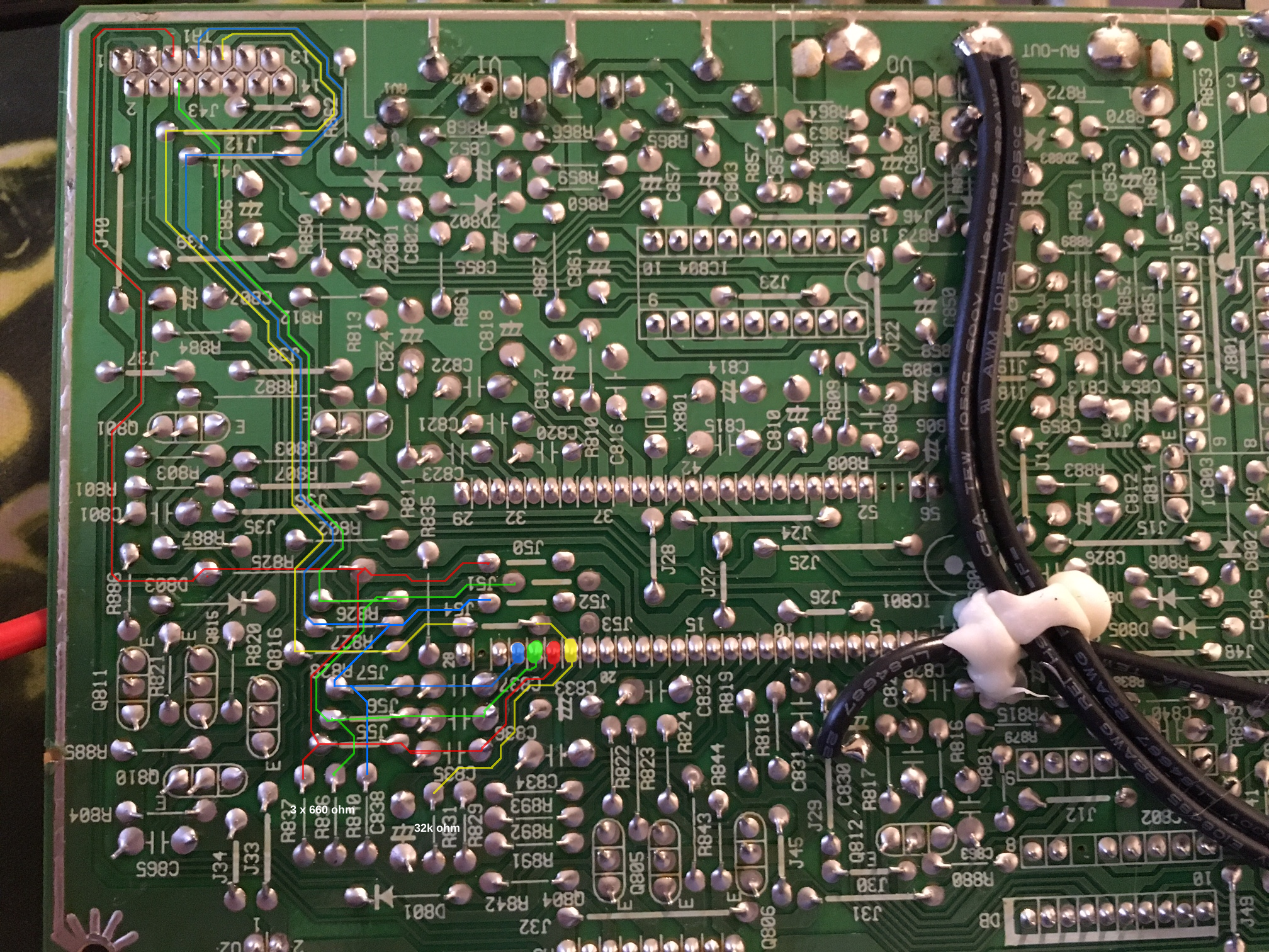 I pulled the daughterboard and brought it to the workbench. I did not have to touch the main chassis of the monitor at all as it was not necessary. I traced out the pins for the unused RGB2 input. The blanking line, YS2, was pulled low through a high-value resistor. The RGB2 input lines had all the termination necessary for a closed-caption board, and they run up to a a header in the corner.